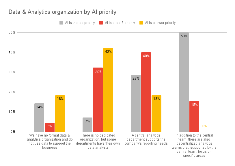 Recent TriFinance research confirms this trend: companies that invest heavily in artificial intelligence (AI) generally have a more mature data and analytics organization. Half of the companies that regard AI as a top priority have, in addition to a central analytics department, decentralized teams supporting finance data analytics initiatives.
